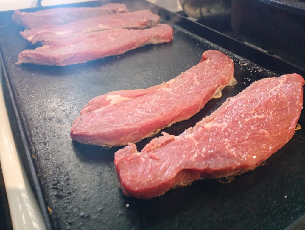 Calentar una plancha o sartén pesada con apenas un toque de grasa o aceite. Colocar los bifes bien secos, y cocinarlos a fuego medio-alto durante 3–4 minutos por lado (dependiendo del punto deseado). Condimentar recién al dar vuelta. Evitá pincharlos para no perder jugos.