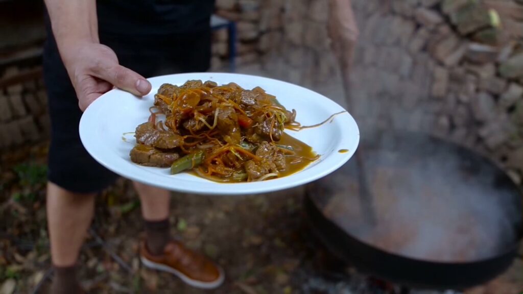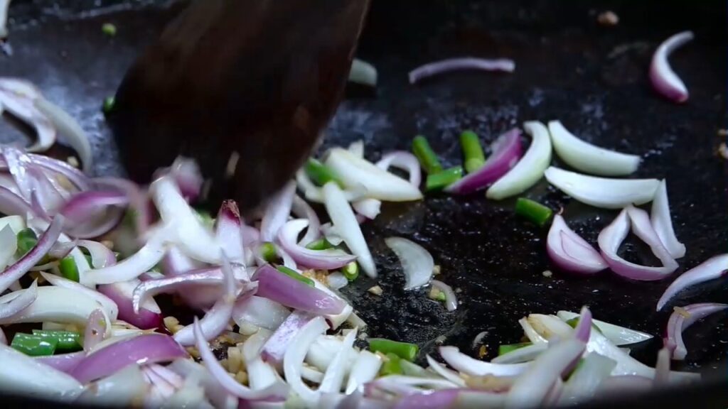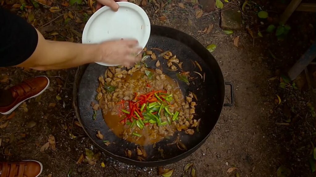 6-Incorporar cebolla cortada en Juliana y locuras que se le ocurrió a nuestro chef como chauchas, jengibre, ajos, un toque de cúrcuma y que vuelva la bondiolita al disco.