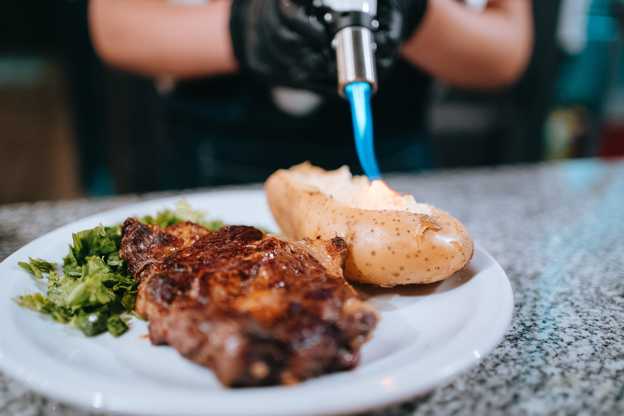 La propuesta es clara y sin rodeos: parrilla argentina en su expresión más honesta. Cortes tradicionales, achuras, porciones generosas y ese punto exacto que solo se logra cuando quien está detrás del fuego entiende que el asado no es apuro, sino paciencia. Cada servicio parece sostener un pequeño ritual. La carne llega chisporroteando, el pan circula, el vino se sirve sin solemnidad y las conversaciones se estiran. En Lo de Juan el tiempo se desacelera; la sobremesa es parte del menú.