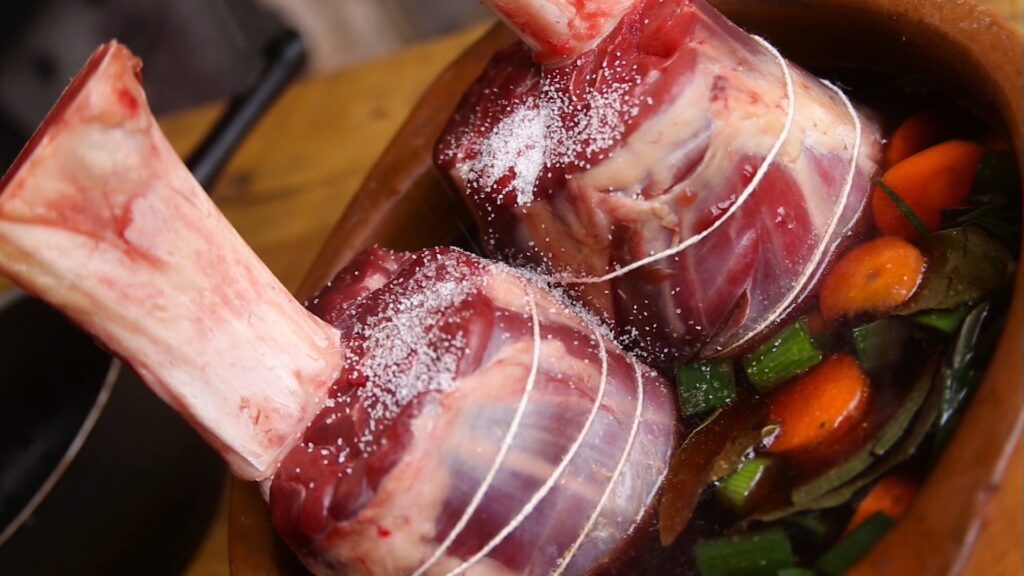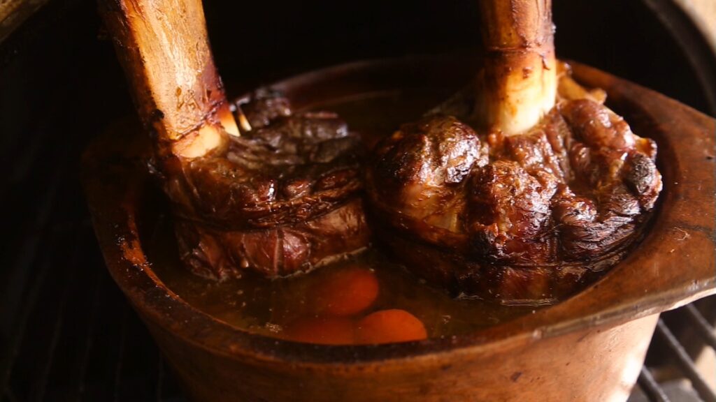 El osobuco es un plato tradicionalmente del norte de Italia. La palabra significa “hueso con agujero” pero en nuestro país solemos llamarlo caracú. Hay varias formas de hacerlo y la más tradicional es hervida en el puchero pero tanto en olla a presión o en horno chileno resulta un espectáculo.