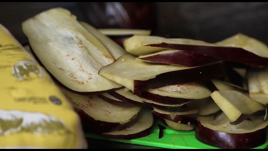 Lavar las berenjenas, cortarlas en rodajas de medio centímetro de grosor. Pueden ser rodajas transversales o longitudinales, según el molde que vayas a utilizar. La receta original pide rebozar y freír la berenjena, pero se puede fritar con aceite a la plancha u en la bandeja del horno con unas gotas de aceite de oliva, hasta que estén tiernas y ligeramente doradas.