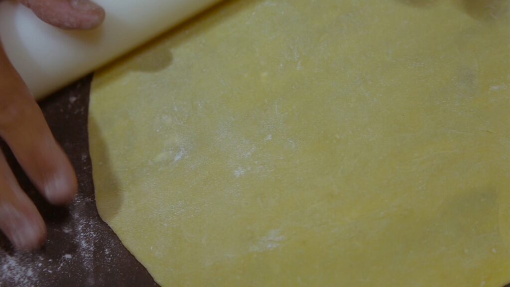 Extraer 6 yemas de huevos de campo (si son más chicos sumar más), formar una corona de harina (300grs aproximadamente), agregar la yema, 50 grs de manteca, una cuchara de licor o ron y mezclar y amasar bien.