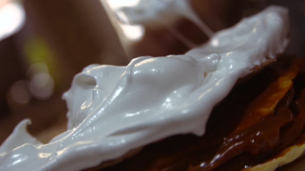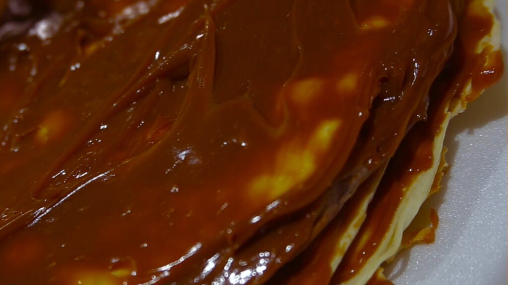 Luego untar con un buen dulce de leche cada capa y guardar en heladera. Mientras tanto con las claras, las batimos con una pizca de sal hasta que estén firmes. Después ir agregando el azúcar (dos cucharadas por clara) y batir hasta que obtengamos punto merengue, con paciencia que se alcanza.
